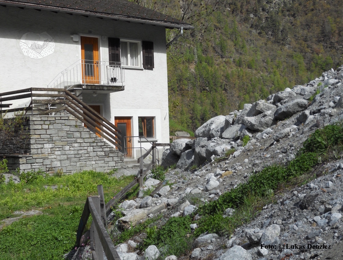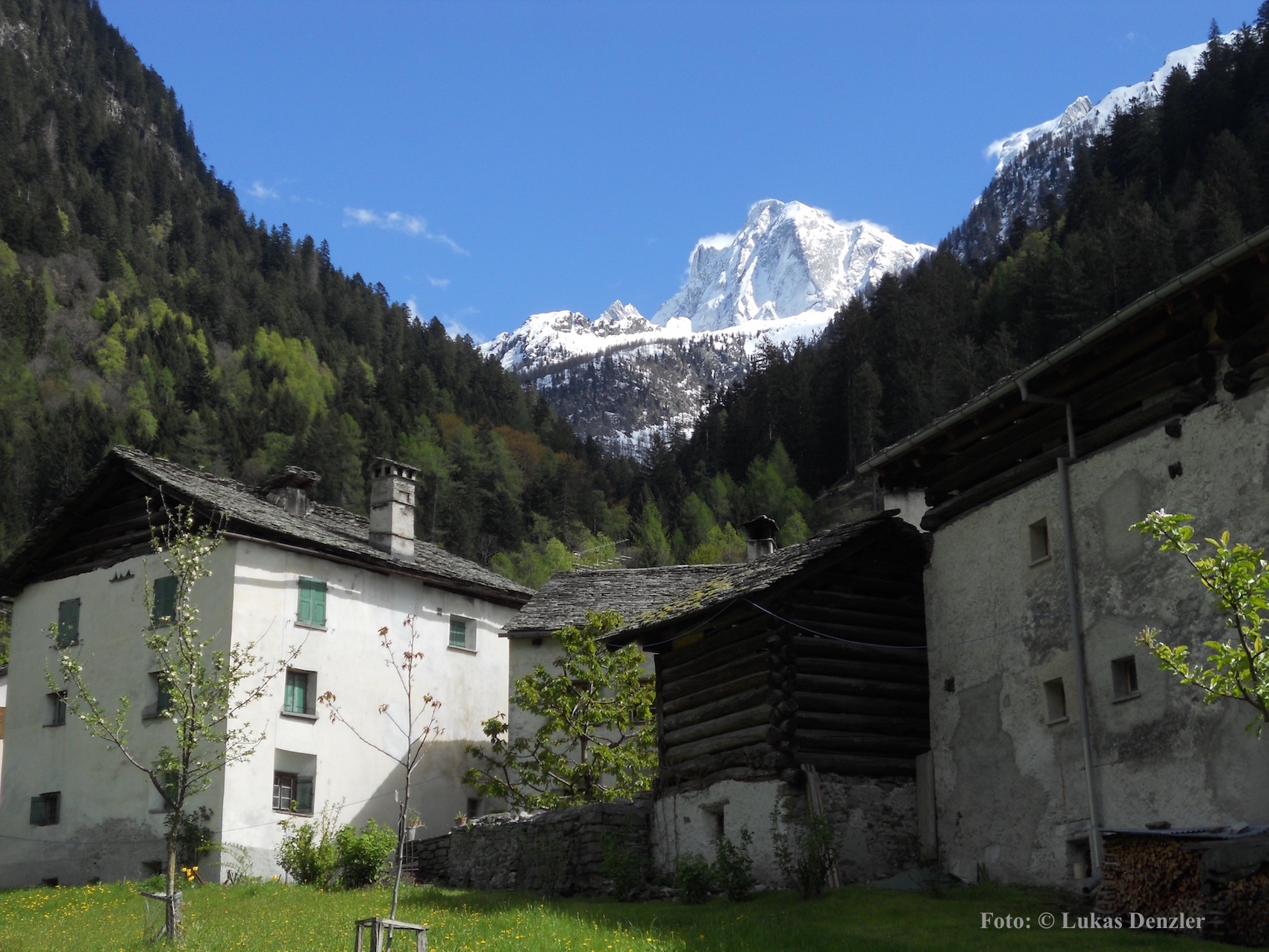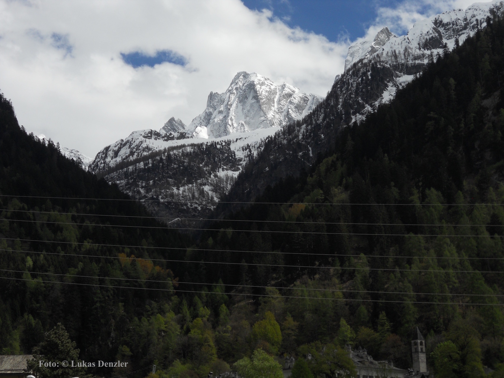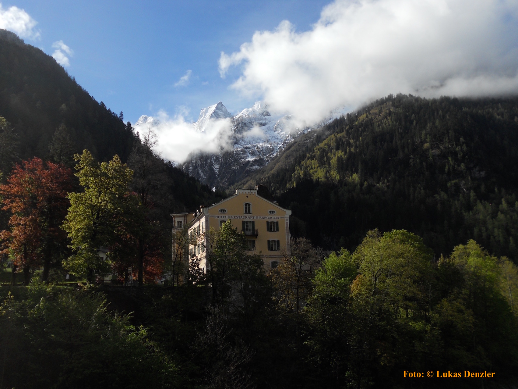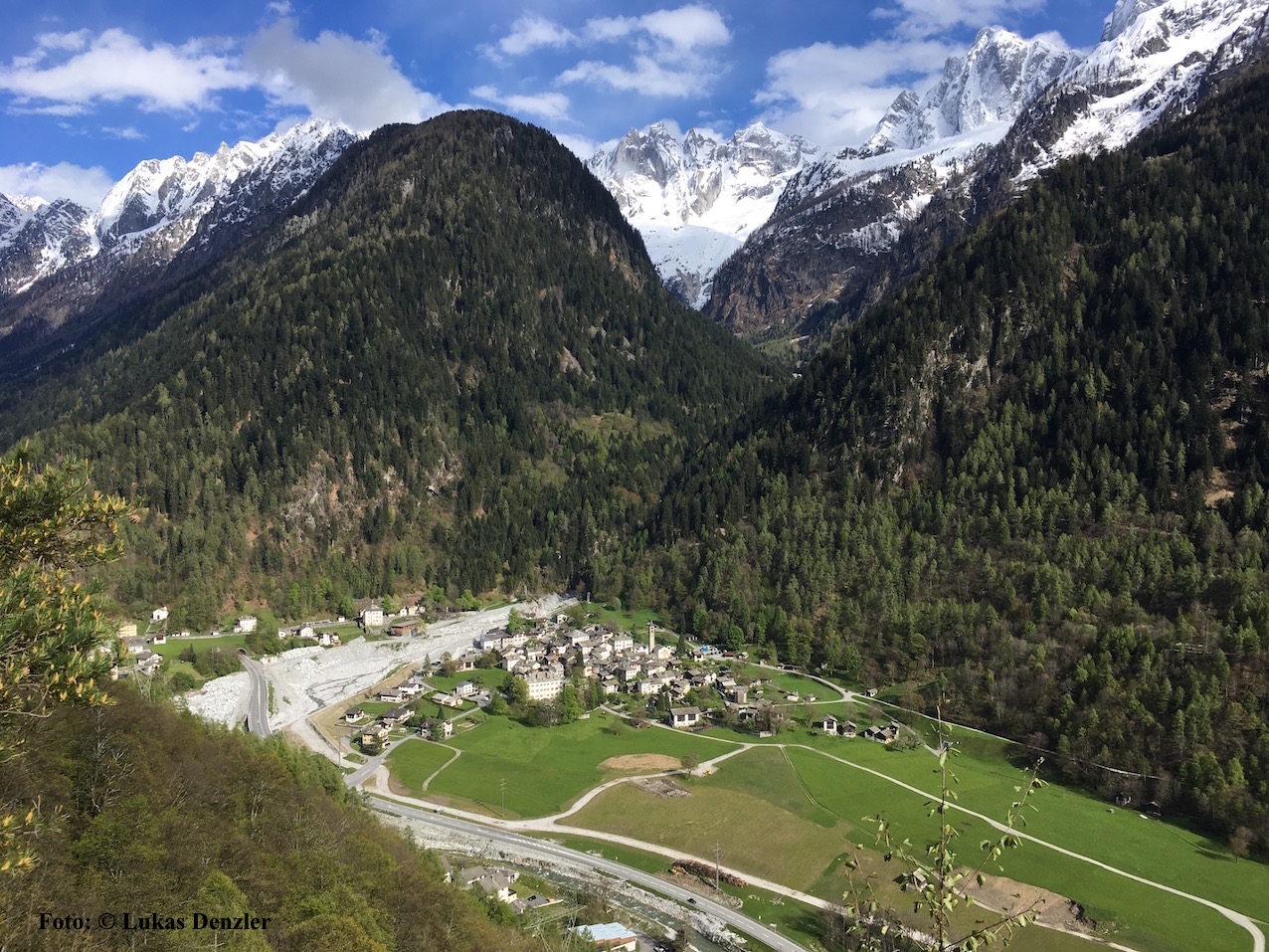 Einen wunderbaren Blick auf Bondo hat, wer den Wanderweg von Promontogno nach Soglio hochsteigt. Mit zunehmender Höhe schaut man auf den Talboden hinunter, sieht auf die grosse Deponie, in der das Cengalo-Material aus dem Auffangbecken aufgeschichtet wurde (Foto). Und von der Terrasse über dem Tal von Soglio blickt man hinüber zu den majestätischen Bergeller Bergen (Foto). In Soglio selber beeindruckt der Palazzo Salis. Und es gibt im schmucken Dorf auch noch einiges mehr zu entdecken (Foto). Doch die Welt steht nicht still: Weil mir der direkte Weg versperrt war (Foto), hätte ich fast das kleine Postauto nach Promontogno verpasst.