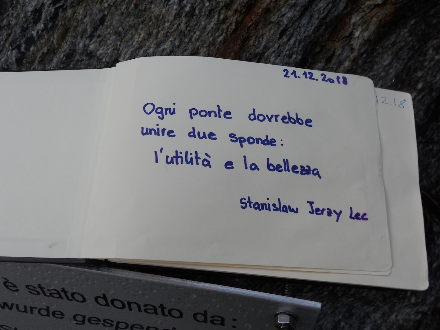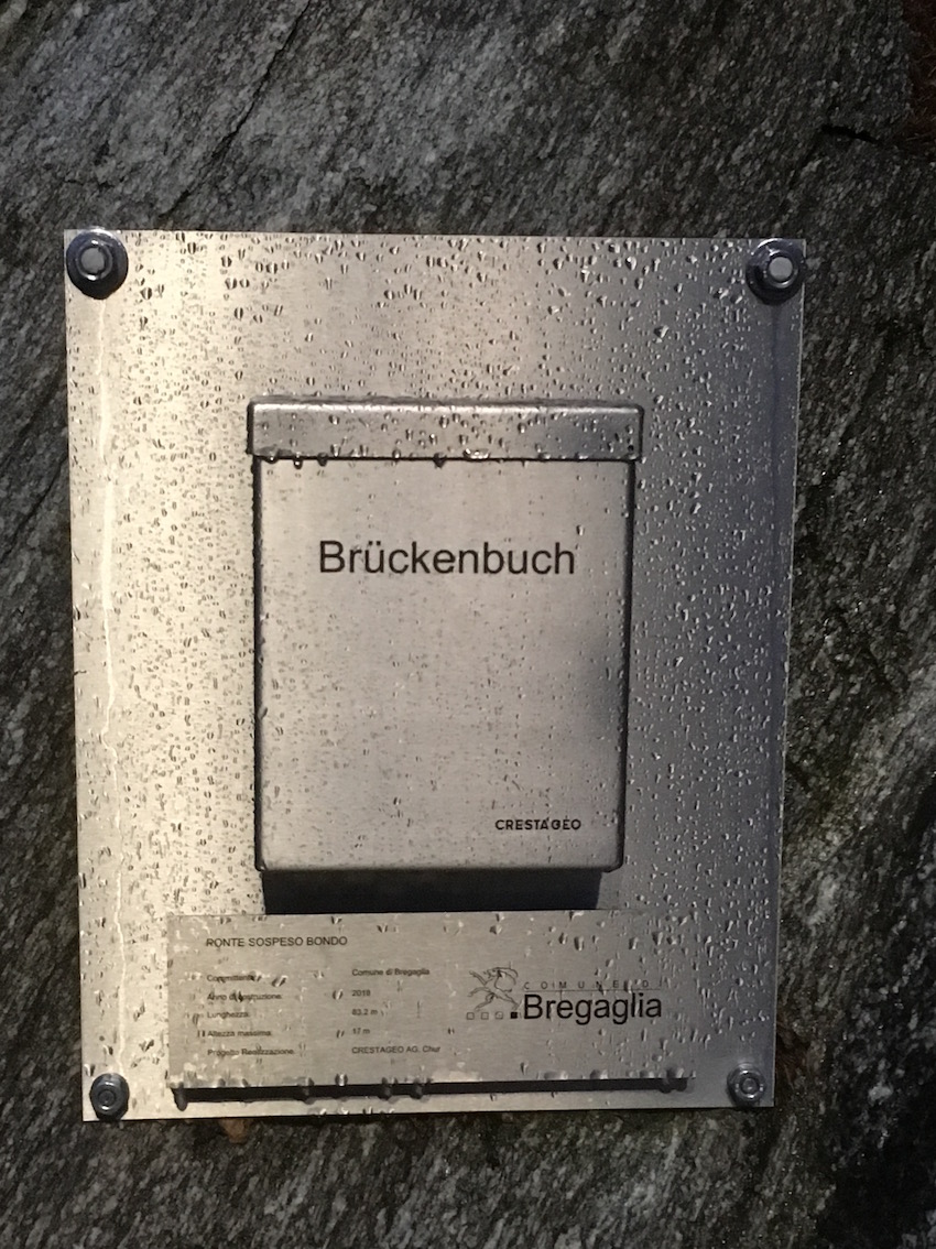 Eines der ersten Projekte der Gemeinde war der Bau der provisorischen Hängebrücke zwischen Bondo und Promontogno an der Stelle der alten Brücke «Punt», die eiligst abgerissen wurde. Wäre sie verstopft worden, hätte sich weiteres Material womöglich direkt in den Dorfkern von Bondo ergossen. Die Hängebrücke schwingt sich in sicherer Höhe über die Bondasca. Trotzdem ist sie mit einem Lichtsignal und einer Sirene ausgestattet. Und mit einem Brückenbuch! Es ist bereits das dritte oder vierte Buch seit der Eröffnung im April 2018 (Foto). Auf der ersten Seite ist zu lesen: «Ogni ponte dovrebbe unire due sponde: l’utilità e la bellezza.» (Foto).