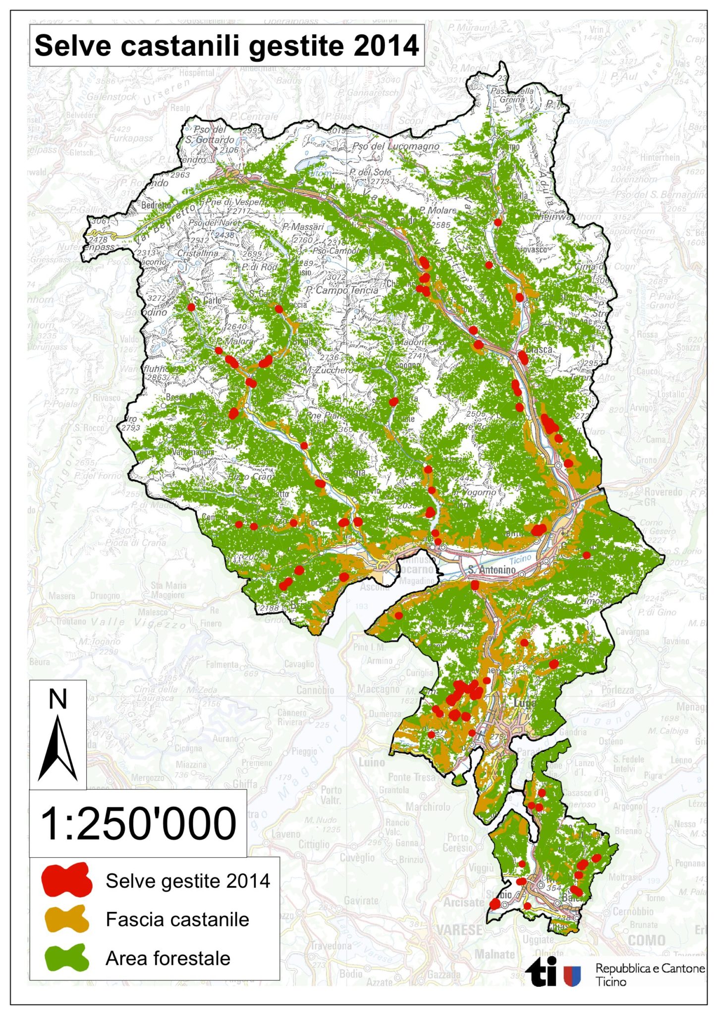 Eine mit den Medienunterlagen abgegebene Karte zeigt, wo überall im Tessin sich Kastanienselven befinden. Im Malcantone ist die Dichte besonders hoch. Aber auch in der Leventina bis Lavorgo oder im oberen Maggiatal pflegte man die traditionelle Form der Kultivierung der Kastanienfruchtbäume. Vor rund 20 Jahren erlebte die Kastanienkultur eine Renaissance, und Kastanienprodukte erfreuen sich inzwischen grosser Beliebtheit.